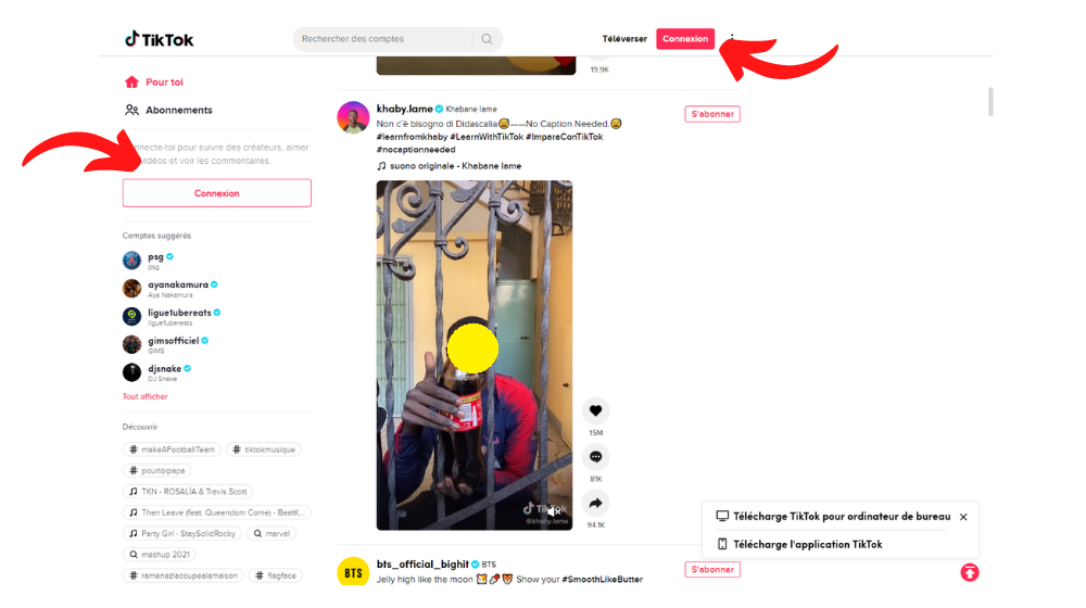3. Vous voici sur la page d'accueil de TikTok. Vous pouvez vous connecter en cliquant sur le bouton « Connexion » (en haut à droite de votre écran ou dans la colonne de gauche de la plateforme).